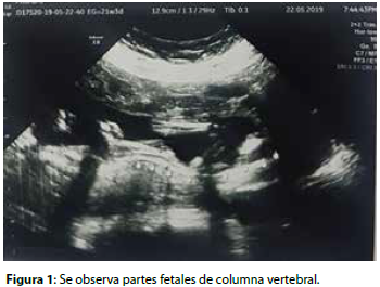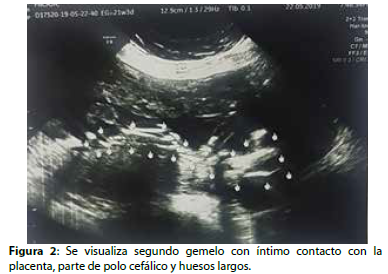 Los exámenes complementarios con reporte de laboratorio de fecha 09/09/19. Ver tabla 1 y de ecografía de 22/05/19 que reporta: embarazo de 20 semanas, placenta fúndica posterior, se observa un segundo gemelo con íntimo contacto con la placenta, la cual no se logra delimitar estructuras del mismo, observándose solo partes fetales de columna vertebral, parte de polo cefálico y huesos largos, sin flujo vascular a la aplicación del Doppler color ( Figura 1 y 2).