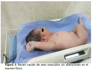 El reporte transoperatorio indica: paciente femenina se somete a cesarea segmentaria tipo Kerr más salpingoclasia bilateral bajo anestesia regional raquídea, donde se obtiene recién nacido de sexo masculino con peso de 3 442 gr, talla 48 centímetros, con APGAR 8 y 9 al minuto y cinco minutos ( Figura 3).