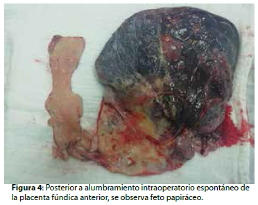 Al examen físico del recién nacido es normal sin alteraciones o malformaciones; y posteriormente, se realiza el alumbramiento de la placenta integra con un feto papiráceo ( Figura 4).