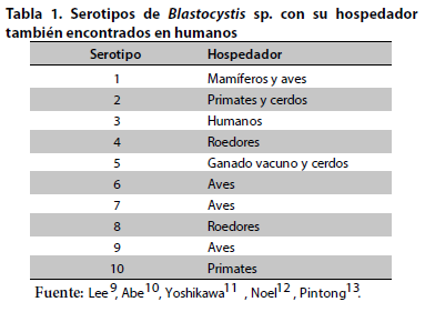 Con base en técnicas de biología molecular se ha puesto en evidencia la gran variabilidad genética de Blatocystissp. (considerado como un complejo de subtipos sin ser consideradas como especies independientes), es así que se han señalado hasta 17 subtipos (ST) (linajes ribosomales) y diversos alelos de los subtipos (variación de subtipos) provenientes de animales y de ser humano (esto son ST1 a ST10), y con este hallazgo surge la pretensión de sustituir la nomenclatura Blatocystishominis por la de Blatocystis species seguida del número de subtipo, por la baja especificidad entre parásito y hospedador humano con expansión de su capacidad para invadir otros hospedadores distintos al inicialmente descrito como exclusivo 7, 8. A continuación se muestra una tabla con los 10 subtipos de Blatocystissp. con su hospedador que han sido aislados de humanos ( tabla 1):