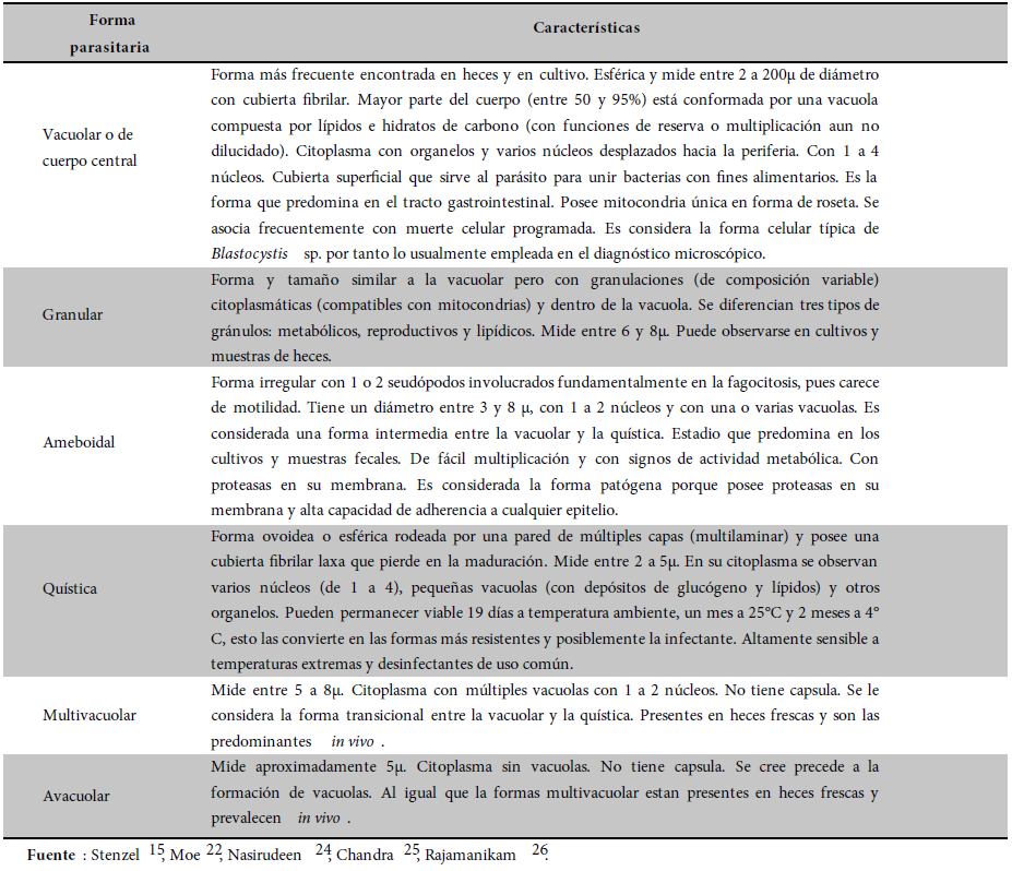Lo cierto es que se ha logrado la infección experimental por vía oral de animales, como las ratas, con las formas quísticas del parásito, en este sentido se señala que el prequiste derivado de las formas multivacuolar o ameboide puede por esquizogonia convertirse en quiste de pared fina o gruesa, el primero implicado en la autoinfección y el segundo en la infección a otros hospedadores 15, 22, 23. En la tabla 2 se indican las distintas formas parasitarias de Blatocystis sp. que denotan el carácter pleomorfico de este organismo.