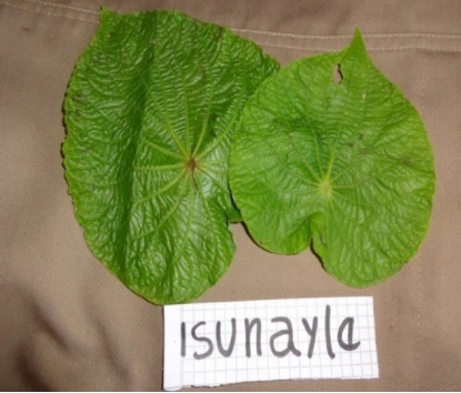 Piper peltatum, isunayle ati en yuracare, es una planta de 1 metro de alto, es peri domiciliaria, lo característico son sus hojas laminadas grandes, tiene varios troncos delgados cada una con 2 a 3 hojas planas.