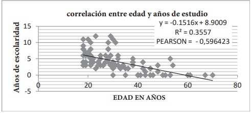 La correlación de Pearson entre edad y años de escolaridad es de 0,59, lo que nos dice que hay una relación negativa, o sea a mayor edad menos años de estudio.