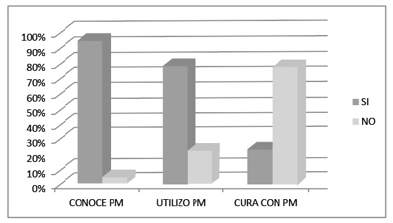 Del 95% de la población conoce o sabe de la existencia de plantas medicinales en su comunidad, pero solo 77% de ellos recurrió a plantas medicinales en alguna oportunidad con fines terapéuticos para su persona o familiares más cercanos, ahora de todos ellos el 22% de los entrevistados refiere que practica la medicina tradicional herbolaria utilizando plantas existentes en sus comunidades, pero esta práctica en el ámbito familiar o en la comunidad ( Figura 2).