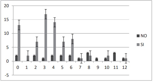 La relacion entre utilizacion de plantas medicinales y años de estudio nos manifiesta que existe una relacion inversa, a mayor grado de escolaridad de la poblacion menor utilizacion de plantas medicinales ( Figura 3), en esta figura los numeros en sentido horizontal de 1 al 12 son los años de estudio y los numeros en sentido vertical son la cantidad de personas que si utilizaron o no plantas medicinales.