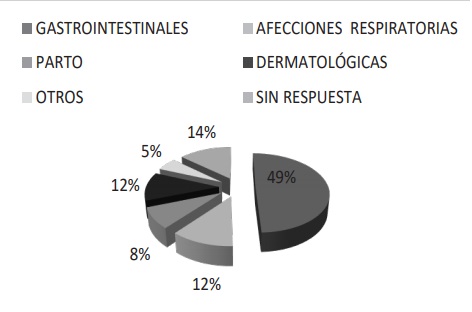 Las afecciones respiratorias fueron el resfrio, tos, pulmonía, dolor de pulmones, y otros, y las afecciones dermatológicas más mencionadas fueron la espundia, heridas, postema, y otros ( Figura 5).