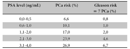 PSA 2 detection has improved prostate cancer (CA) detection 6, however, there is no specific normal or abnormal PSA concentration in the blood, and concentrations may vary over time, depending on the laboratory method, 4.0 ng/ml or less is considered the standard PSA value. The Gleason score is the most important predictor of prostate CA follow-up, metastasis and specific mortality. It is associated with an increased risk of biochemical recurrence and disease progression 4 ( Table 1).