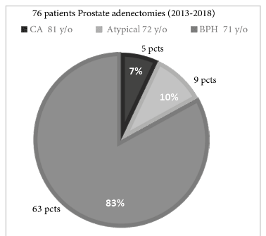Methods:retrospective longitudinal study from 2013-2018 in the city of Cochabamba-Bolivia; study population: patients submitted to simple, retropubic and/or transvesical prostatectomy. Data collection: based on medical records, patients with clinical symptoms of benign prostatic hyperplasia and total PSA < 4ng/ml.