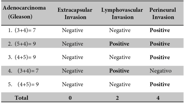 Resultados: se identificó 76 pacientes, de los cuales; 5 pacientes resultaron con Adenocarcinoma y 9 pacientes con: Neoplasia Intraepitelial Prostática de Alto Grado 2,6 %, Proliferación acinar pequeña atípica 7,9%, representando así un 10,5%. En cuanto a la invasión representaron un 5,3% con invasión perineal, 2,6% invasión linfovascular y ninguno con invasión extravascular.