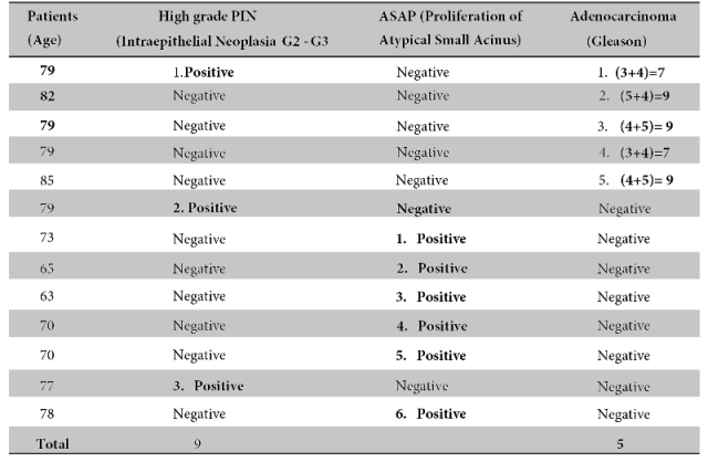 Regarding precancerous or atypical stages, there were 9 patients representing 10.5% ( Table 2), with high-grade PIN (Intraepithelial Neoplasia G2-G3) 2.6%, ASAP, 7.9%. Of these, 8 patients are older than 75 years who are at risk for cancer development during the next 10 years.