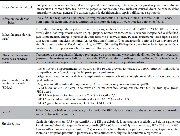 Basados en las recomendaciones de Calvo et al. ( Tabla 1) de la Asociación Española de Pediatría, se define la gravedad en síndromes clínicos integrando los criterios oficiales de la OMS para un manejo estandarizado. Mencionamos sin embargo que los criterios diagnósticos de gravedad propuestos por Dong et al. incluyen una primera fase de infección asintomática sin ningún síntoma, ni signo clínico, RX del tórax normal, con PCR para SARS-CoV 2 positivo.