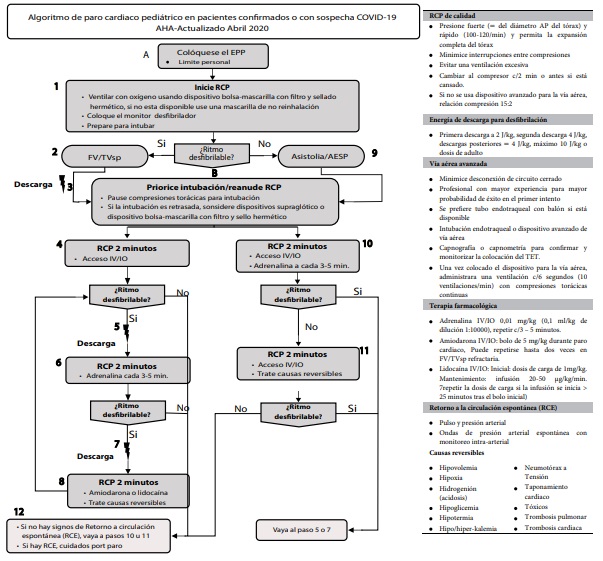Uno de los escenarios que puede generar un mayor reto en el personal de salud es el paciente que presenta una parada cardiaca y que sea un caso sospechoso o confirmado de COVID-19. Los consensos internacionales en relación a la reanimación avanzada establecen las siguientes recomendaciones y modificaciones en el algoritmo de reanimación avanzada pediátrica ( Figura 1)
