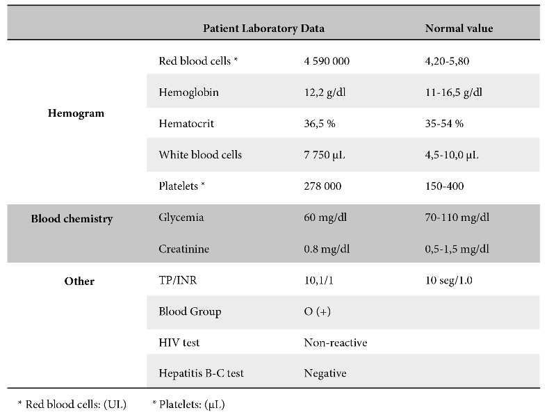 The Obstetrics and Gynaecology Department decided to terminate the pregnancy with the diagnosis of pregnancy at 39.2 weeks, previous caesarean section and prodromal labour, and requested an assessment by anaesthesiology. The patient reported that she was fasting for more than two hours and the pre-anaesthetic evaluation is detailed below: