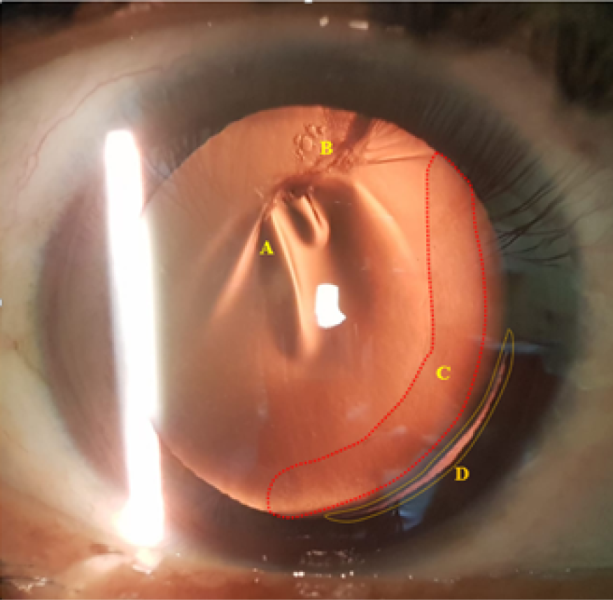 This is the case of a 26-year-old male patient, a bricklayer, who came for consultation due to a progressive decrease in visual acuity in the right eye, with a history of blunt eye trauma with a stone, two months prior to the consultation, while carrying out construction work. On ophthalmological examination he had a visual acuity of the right eye (OD) of finger count at 3 metres, left eye (OI) of 20/20. On biomicroscopic examination under mydriasis ( Figure 1) in OD: folds were observed in the anterior capsule at 12:00 hrs. as a result of capsular fibrosis in situ, formed from a small rupture caused by the trauma, in addition to a traumatic cataract that is in progress from 3:00 to 6:00 hrs.The patient also has a subluxation of the crystalline lens towards the superior temporal as a result of the rupture of the Zinn?s zonule in the inferior nasal area, caused by the strong contusive impact, and finally the presence of vitreous in the anterior chamber from 2:00 to 7:00 hrs. ( Figure 2). OI: normal anterior segment. Fundus examination of both eyes showed no alterations.