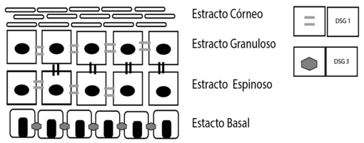Para poder entender el mecanismo fisiopatológico de la lesión cutánea, es necesario reconocer la estructura molecular de las uniones intercelulares. A dicho nivel las uniones se dan por medio de desmogleina (DSG), una estructura proteica que permite la unión intercelular. Existen tres tipos, la tipo 2 (DSG2) se encuentra en todos los tejidos del organismo. Las desmogleinas tipo 1 y 3 (DSG1, DSG3) se encuentran sobre todo en la epidermis.