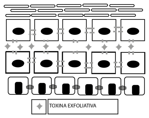 El DSG 1 se encuentra en los estrados superficiales hasta el estrado granuloso y espinoso, mientras que la DSG3 predomina en los estratos basales. La toxina exfoliativa actúa de forma selectiva rompiendo los enlaces peptídicos de la desmogleina., desprendiendo las uniones celulares, debido a que la DSG1 no se encuentra en los estratos más profundos y solo en los estratos superficiales, la lesión que producen son la descamación, exfoliación y la ampolla. Todas estas lesiones se resuelven sin dejar lesión cicatrizal al no afectar el estrato basal. ( Figura 1 y 2).