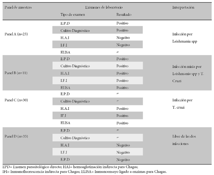 Las muestras incluidas en el panel A, correspondientes a 23 personas, se identificaron como infección por Leishmaniaspp en base a los resultados de diagnóstico clínico y por laboratorio. Las muestras del panel B, pertenecían a 11 personas que presentaban infección mixta por Leishmaniaspp y T. cruzi, según los resultados de laboratorio de diagnóstico realizados. Así mismo las muestras incluidas en el panel C correspondían a 30 personas con infección por Trypanozoma cruzi. Finalmente, las muestras del panel D pertenecían a 33 personas sin evidencias de ninguna de las infecciones indicadas.