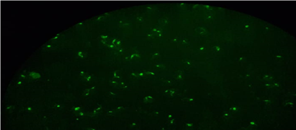Las lecturas se registraron como: Positivo para Chagas(+). Cuando la superficie o los bordes de los parásitos fluorescieron de un color verde manzana intenso. Positivo para Leishmania. Se registró, cuando el núcleo de los parásitos fluorescieron de un color verde manzana intenso, de acuerdo con la ref 16.