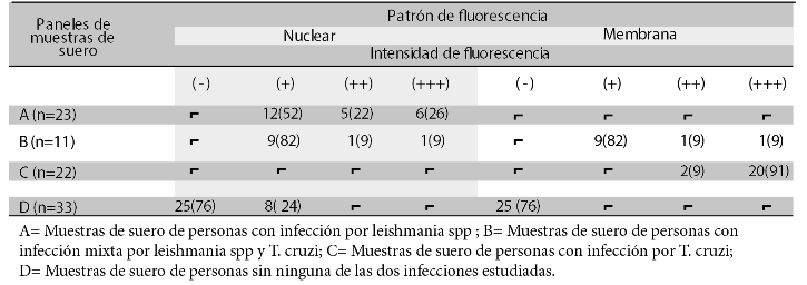 La observación microscópica de la reacción entre los epimastigotes de T. cruzi empleados como antígeno figurado para la técnica de microscopia de inmunofluorescencia con las muestras de suero del Panel ?A?, correspondientes a personas con infección por Leishmaniaspp ( Figura 1 y Tabla 2), evidencia la presencia de un patrón de fluorescencia nuclear exclusivamente que se visualiza como fluorescencia interna que se irradia hacia la periferia.