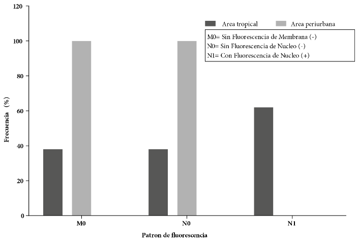 Al análisis de las muestras que no presentaban ninguna evidencia de infecciones por T cruzi ni Leishmaniaspp , agrupadas según correspondía a personas residentes en el área tropical (AT) o área periurbana de la ciudad de Cochabamba (AP), reflejaron ausencia de fluorescencia a nivel de membrana (M0) y de núcleo (N0) en el 38% de las muestras del AT y en el 100% de las muestras AP. La presencia de fluorescencia nuclear con intensidad una cruz (N1) se observó en el 62% de las muestras AT ( Figura 4).
