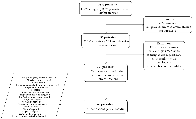 Métodos:se realizó un estudio prospectivo, observacional en un hospital quirúrgico terciario; seleccionamos pacientes sometidos a procedimientos menores y ambulatorio, excluyendo aquellos con comorbilidades, riesgo quirúrgico de sangrado alto o con medicación que interfiera con la coagulación.