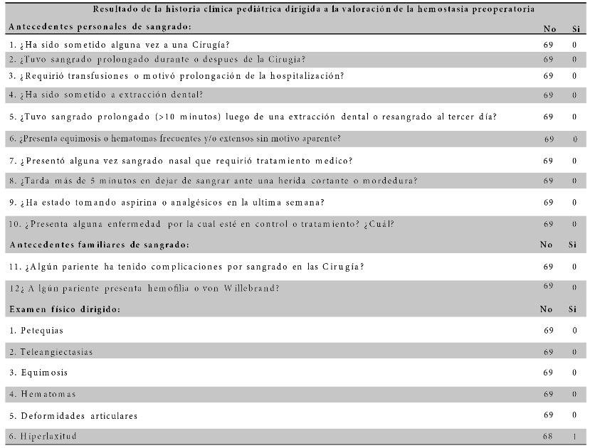 Todos los pacientes fueron evaluados clínicamente por un pediatra, el cual aplico los cuestionarios y el examen físico dirigido a la valoración de la hemostasia, encontrando 1 paciente sospechoso de coagulopatía (1,5% de los casos), sin embargo, dicho caso tuvo los resultados de los exámenes complementarios normales, no presentó sangrados intra o postoperatorios, ni fue diagnosticado de una coagulopatia posteriormente ( Tabla 1).