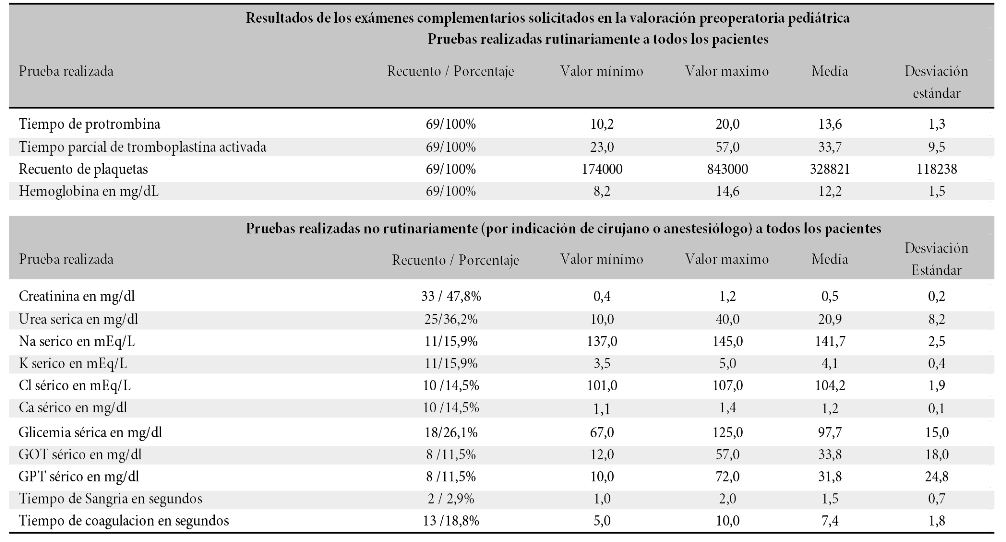En 69 pacientes se realizaron 218 exámenes complementarios (69 rutinariamente y 149 no rutinariamente), en los pacientes en los que se solicitaron exámenes no rutinarios los más solicitados fueron la creatinina 47,8%, Urea 36,2%, Glicemia 26,1% Na y K 17%, Cl y Ca 14,5%, GOT y GPT 11,5%, Tiempo de coagulación 18,8% y tiempo de sangría 2,9%; el motivo de dichas solicitudes se basa principalmente en el criterio del cirujano tratante o del anestesiólogo que asistirá el procedimiento, vale mencionar que ningún paciente tiene comorbilidades o patología de base conocidas en la historia clínica y que solo en 1 caso se evidencio al examen físico un hallazgo sugerente de coagulopatía, siendo los demás pacientes sin indicación pediátrica que justifique clínicamente la solicitud de dichos estudios. El resultado de los exámenes solicitados en cuanto a sus valores medios y el desvío estándar se encuentran dentro de los rangos normales para la edad ( Tabla 2).