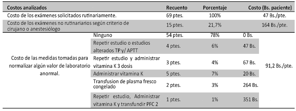 Los cargos a los pacientes ascendieron a 47 Bs por paciente de forma rutinaria, y de 255 Bs por paciente por cargos asociados a pruebas no rutinarias o destinados a la corrección de valores alterados en 15 pacientes; por lo que en término medio se eroga un costo en pruebas de laboratorio preoperatorios de aproximadamente 102 Bs por paciente.