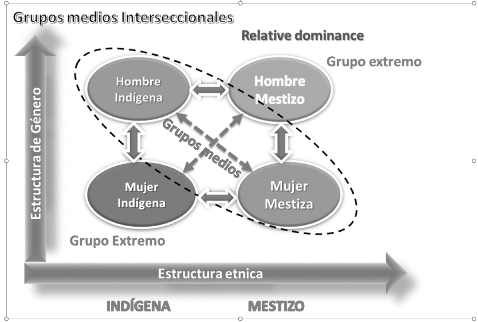 En concordancia con el procedimiento ilustrado por Sen & Iyer 10, 12 el género y la etnicidad se combinaron para formar cuatro posiciones interseccionales mutuamente excluyentes, incluidos los grupos extremos: dominantes o con doble ventaja social (hombres-mestizos) y de mujeres indígenas con doble desventaja social; los grupos medios de mujeres mestizas y hombres indígenas ( Gráfico 1).