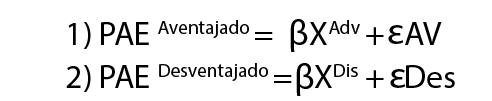 Donde PAE es la variable de resultado; ? es el coeficiente que incluye el intercepto; X es la variable explicativa, y ? es el error. La brecha entre los dos grupos desaventajado (Dis:disadvantajed) y aventajados (Adv: advantajed) es: