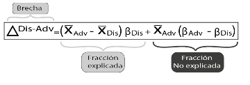 La primera parte del lado derecho de las ecuaciones anteriores es la diferencia observable en las variables en el dos grupos (el componente explicado), y la segunda parte está relacionada con las diferencias en los coeficientes de las variables en los dos grupos (componente no explicado) 13.