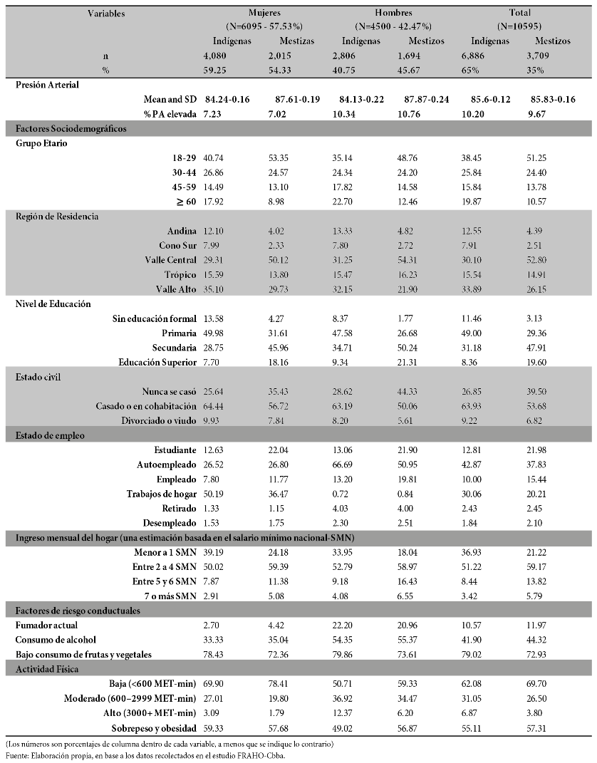 Participaron en el análisis final 10595 sujetos, el 65% de los participantes se autoidentificaron como indígenas y 35% mestizos.