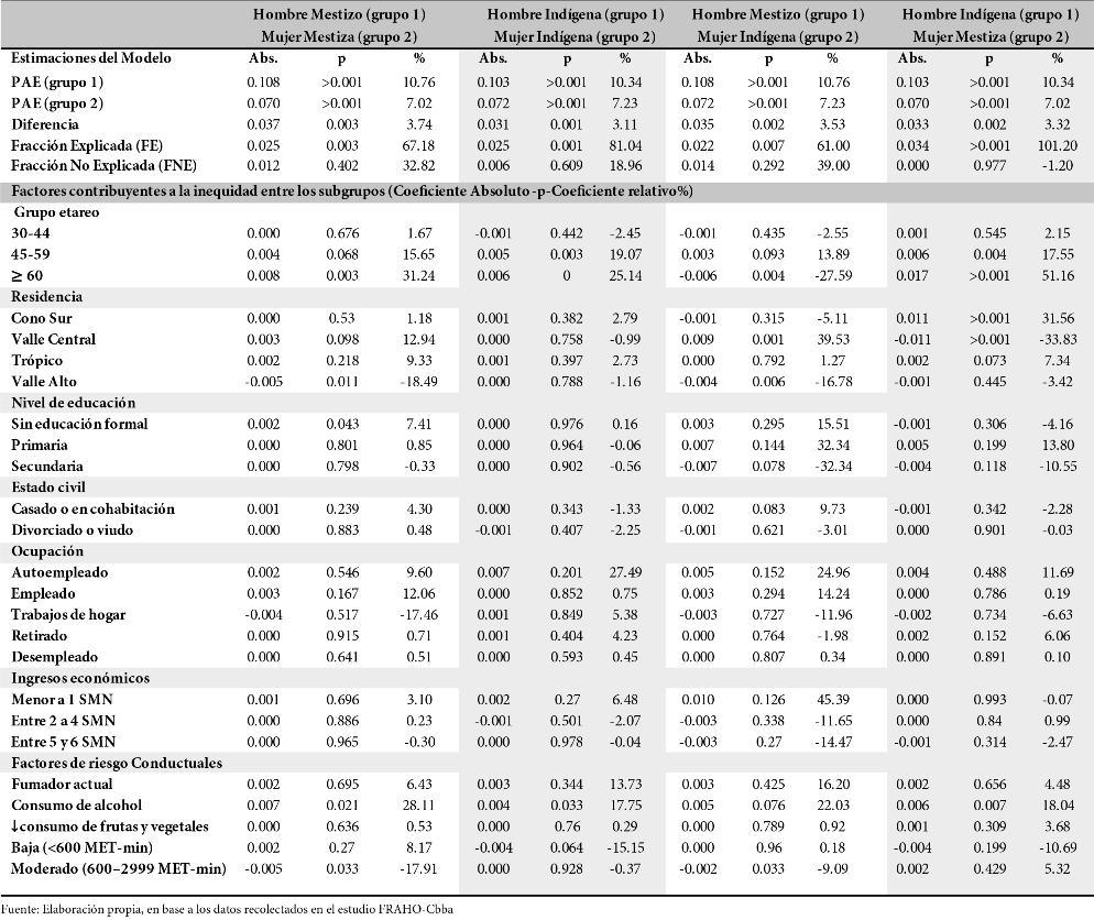 Resultados:la prevalencia de PAE fue mayor en los hombres-mestizos (10,76%); la disparidad por referencia de género fue más importante entre mestizos (3,74%) e indígenas (3,11%); la disparidad interseccional entre grupos extremos (3,53%) fue mayor a la disparidad entre grupos medios (3,32%). La edad, el tipo de trabajo y estilos de vida, contribuyeron más para explicar estas diferencias.