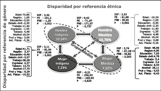 Results:The prevalence of HBP was higher in mestizos men (10.76%); the disparity by gender reference was more important between mestizos (3.74%) and indigenous people (3.11%); the intersectional disparity between extreme groups (3.53%) was greater than the disparity between middle groups (3.32%). Age, type of work, and lifestyles contributed more to explain these differences.