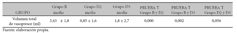 El volumen total usado de vasopresor (etilefrina en bolo) en el grupo B fue de 3,44 ± 1,8 ml; para el grupo D3 fue de 1,8 ± 2,7 ml y para el grupo D2 fue de 0,85 ± 1,6 ml. Estadísticamente significativo entre el grupo B y D2; grupo B y D3. No tiene significancia entre el grupo D2 y D3 ( Tabla 4).
