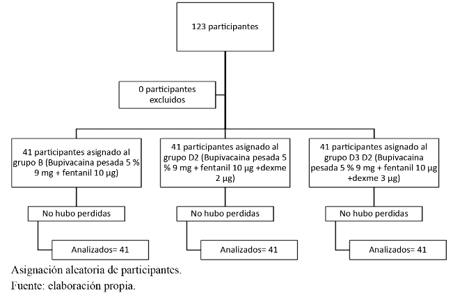 Métodos:ensayo clínico aleatorizado y simple ciego. La muestra fue de 123 pacientes, cada grupo de 41 pacientes cumpliendo ambos criterios. Grupo B (bupivacaina + fentanil); grupo D2 (bupivacaina + fentanil+ dexmedetomidina 2 µg) y grupo B3 (bupivacaina + fentanil+ dexmedetomidina 3 µg). Análisis estadístico: se utilizó el software SPSS® 25 y Excel® 2016. Con un nivel de confianza del 95 % y error muestral del 13 %.