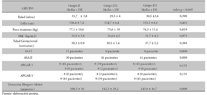 Para la duración del bloqueo motor fue de 106,5 ± 16 minutos en el grupo B; 142,3 ± 28,2 minutos en el grupo D2 y 145,6 ± 16,7 minutos en el grupo D3. Siendo significativo entre los grupos de estudio (valor p < 0,000). Ver tabla 1