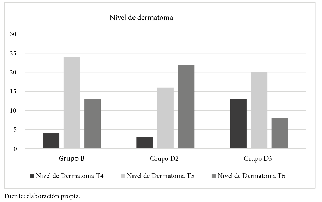 El nivel de dermatoma más frecuente es T5 en el grupo B y D3. Ver Figura 1