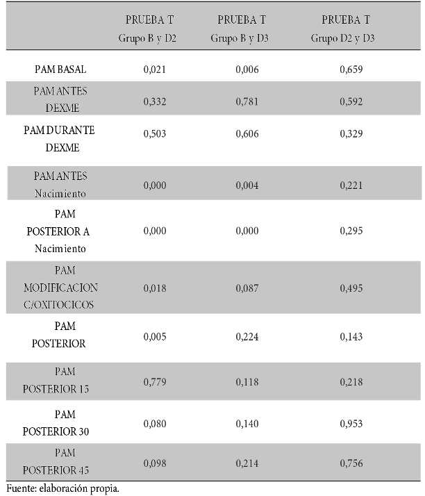 Mientras que, la presión arterial media medido antes y posterior al nacimiento es estadísticamente significativo entre los grupos B y D2 ( valor p < 0,000), similar resultado entre el grupo B y D3 ( valor p < 0,004). No existe significancia entre los grupos D2 y D3. Ver Figura 2 y tabla 2