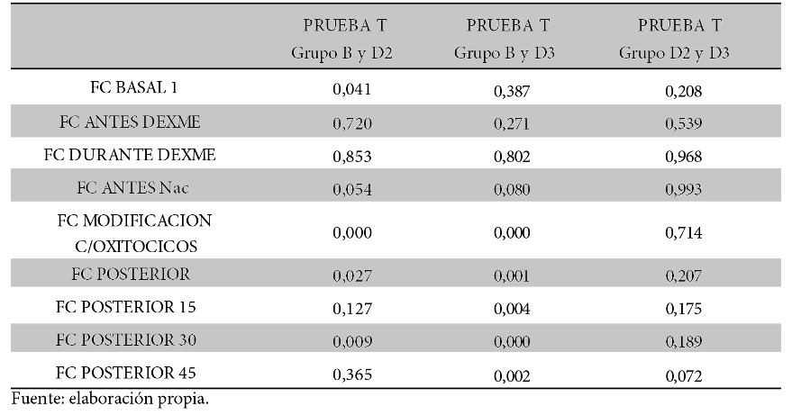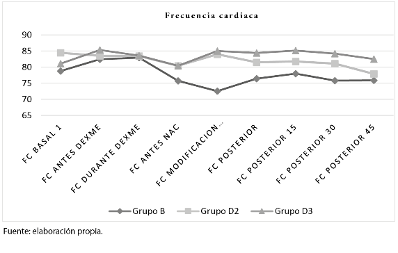 Con respecto a la frecuencia cardiaca, existe una diferencia significativa posterior a la administración de oxitócicos ( valor p < 0,000) entre el grupo B y D2 mientras que en el grupo B y D3 se demuestra mayor significancia después del uso de oxitócicos; a los 15, 30 y 45 minutos posteriores a la administración de los anestésicos locales ( valor p < 0,000; 0,001; 0,004; 0,000 y 0,002 respectivamente). Por otra parte, no existe significancia entre los grupos D2 y D3 ( Figura 3 y Tabla 3).