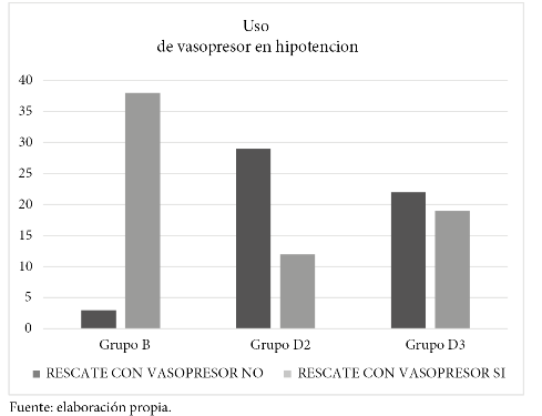 En cuanto al uso de vasopresores posterior a una hipotensión fue más frecuente en el grupo B en unas 38 pacientes seguido del grupo D3 en 19 pacientes y por último, en el grupo D2 solo en 12 pacientes. Siendo estadísticamente significativo con un Chi ? 2 0,000 ( figura 4).