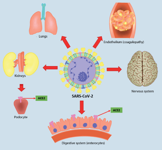 Symptoms of COVID-19, a disease so named by Dr. Tedros Adhanom Ghebreyesus, Director General of the World Health Organization (WHO) on February 11, 2020, varies depending on whether it is a mild, moderate or severe form of the disease 4. In mild cases of COVID-19, symptoms may include thermal rises, dry cough, malaise, myalgia, anosmia and ageusia; some patients have gastrointestinal symptoms, such as anorexia, nausea, vomiting and diarrhea 1. Severe cases of COVID-19 occur mostly in patients with chronic underlying disease such as cardiovascular disease, diabetes mellitus, chronic kidney disease and obesity among others; however, it has also been reported in patients without comorbidity of all ages 5, 6. These patients may have serious complications such as acute respiratory distress syndrome (ARDS) with dyspnoea and hypoxaemia, lymphopenia, central or peripheral nervous system disorders, renal failure, heart failure, hepatic failure, haemopathies and shock 5- 8. This article will attempt to elucidate the molecular basis of the pathophysiology of COVID-19, which will help us to understand not only the disease, but also its complications and the mechanisms necessary to reach the multi-organ failure that occurs in several reported cases of this disease (See figure 1).