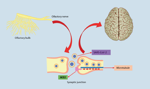 It is believed that there is a retrograde axonal transport of SARS-CoV-2, where axonal microtubules are used to facilitate the transport of the virus into the CNS; the route of entry in this case is thought to be the olfactory neurons, as a study has been described with mice in which chemical ablation of these neurons protected them from infection 47 ( Figure 4).