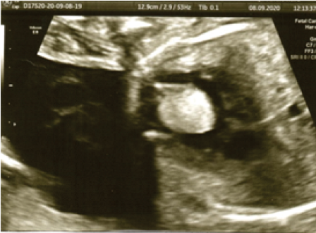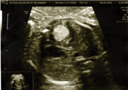 Rhabdomyomas are rare fetal cardiac tumours that may be present in up to 86 % of newborns. They are mostly found in the interventricular septum, atrial or ventricular free wall and infrequently in the atrioventricular valves. It depends on the size of the tumour to have fetal haemodynamic repercussions.