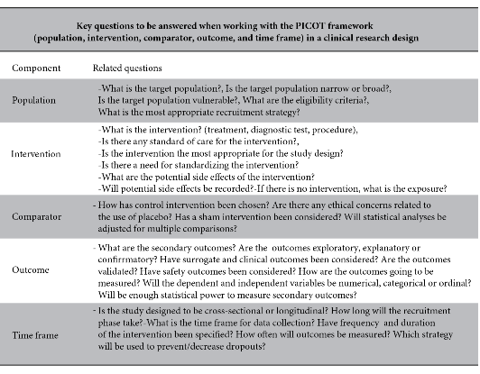 For all that mentioned, the following should be emphasised, the PICOT format 5, 7, is an acronym indicating necessary elements that the research question should contain: P (Population: Helps to identify Universe and Sample) , I(Intervention and/or Exposure: Describes whether the research will be with intervention or observation of the study event.), C (Comparison: Identifies whether there will be two or more groups to be evaluated in relation to the type of study, not always mandatory to describe, especially in cross-sectional studies.), O (Outcome: Describes how the results will be measured.), T(Time: States the time spent on the research.).