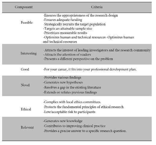 The FINGER format 6, 7is an acronym that helps to elucidate whether the research question is: F (Feasible: indicating whether it will have the participants, human and financial resources and reasonable time to be completed), I (Interesting: the interest that the scientific community could have in the proposed study), N (Novel: new scientific findings), G (Good: enhances career/line of research), E (Ethical: ensuring that the risk to participants is low/acceptable, this always reviewed and endorsed by a team of ethics experts), E (Ethical: ensuring that the risk to participants is low/acceptable, this always reviewed and approved by a team of ethics experts) and R (relevant: for the improvement of clinical practice and the future of research). Table 2provides a summary and brief recommendations of the FINGER format.