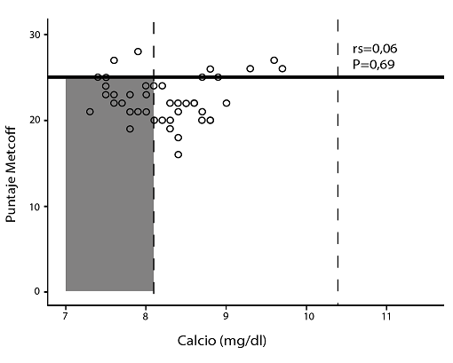 A continuación, se muestra la representación gráfica del análisis de correlación entre los valores de Calcio sérico en los neonatos estudiados y sus respectivos puntajes Metcoff. La línea horizontal en rojo es el límite Metcoff de desnutrición, las líneas verticales segmentadas representan el rango entre el promedio normal y 2 DS. Obsérvese que un solo neonato muestra valores por encima del promedio; todos los demás, incluyendo aquellos con puntajes Metcoff mayores a 25, se hallan por debajo del valor de la mediana ( Gráfico 4).