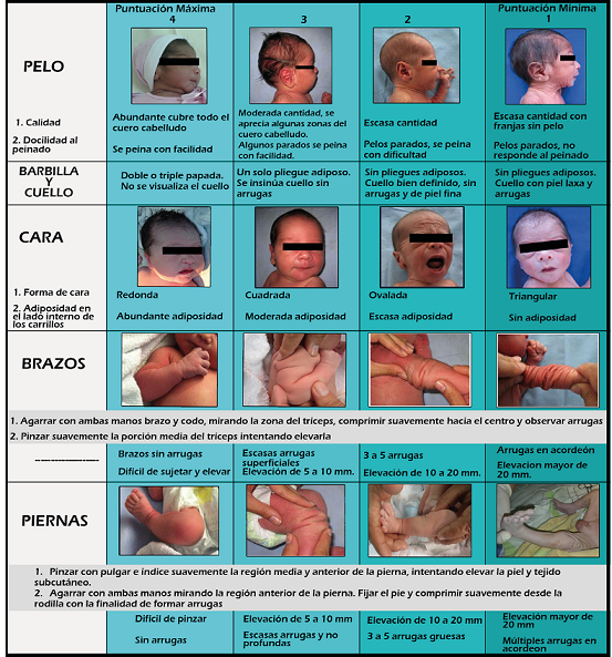 Desde hace algunos años, se acepta ya que ser pequeño para la Edad Gestacional no es sinónimo de Restricción de Crecimiento Intrauterino. Sin embargo, a esta precisión aún le falta la evaluación clínica de los compartimientos graso y muscular de los RN. Aunque los parámetros antropométricos (peso, talla y perímetro cefálico) usados en la evaluación nutricional del recién nacido pueden ser normales, algunos RN a término con peso adecuado para su edad gestacional (AEG) sufren de desnutrición fetal cuando se valoran dichos compartimientos a través del puntaje de Metcoff 32. La encuesta de Metcoff (EM), validada en 1994, es un método clínico para la identificación de trastornos nutricionales en los recién nacidos a término y el diagnóstico diferencial de aquellos «pequeños al nacer» 35- 37. Entre las propiedades de este instrumento se cuentan: es sistemático, resulta de fácil aprendizaje y utilización en la identificación del RN a término desnutrido y consiste en evaluar 9 signos clínicos superficiales que diferencian los recién nacidos bien o mal nutridos (Figura 1a- 1b).