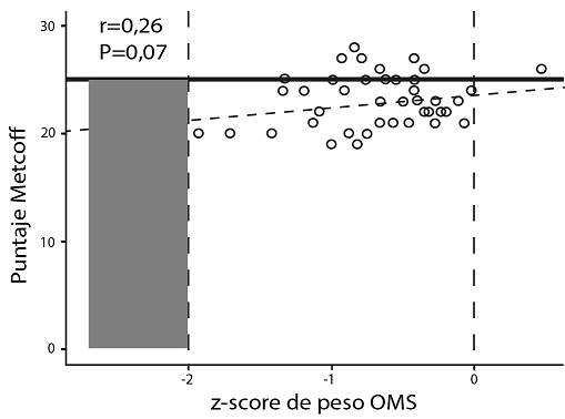 La línea horizontal sólida, representa el punto de corte del Puntaje Metcoff, fijado en 25; "r" representa el valor de la correlación de Pearson y P la probabilidad correspondiente. La línea punteada representa la relación lineal entre ambas variables, las líneas segmentadas son la mediana poblacional (0) y -2? del peso al nacer.