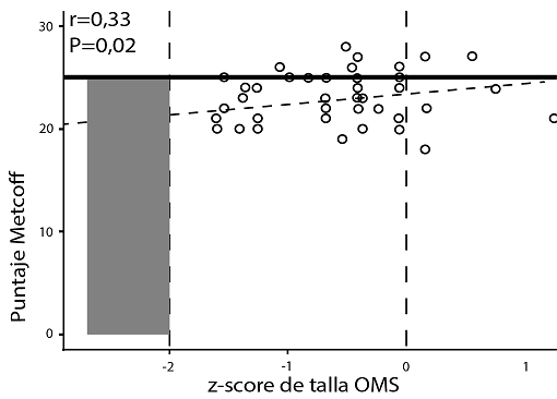 La línea sólida horizontal, representa el pinto de corte del puntaje Metcoff. r representa el valor de la correlación de Pearson y P la probabilidad correspondiente. La línea punteada representa la relación lineal entre ambas variables, las líneas segmentadas son la mediana poblacional (0) y -2? de la talla al nacer.